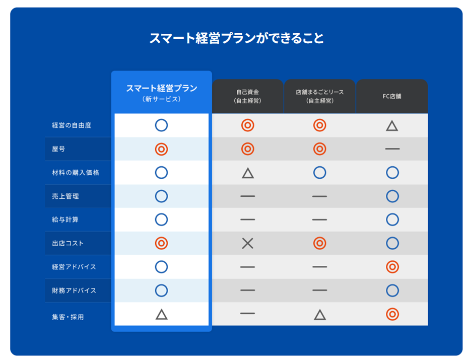 「スマート経営プラン」は、物件契約金(保証金)、内装費、器具設備費などの初期費用を当社が立て替えるだけでなく、売上管理、給与計算、労務管理、POS・決済システム、通信・IT・設備インフラ等のBPO業務を包括的に提供するサービスです。利用者は毎月一定額を支払うスキームとなっており、売上歩合は一切発生しません。また、ビューティガレージでの商材仕入れにおいて、一定の割引も受けられます。